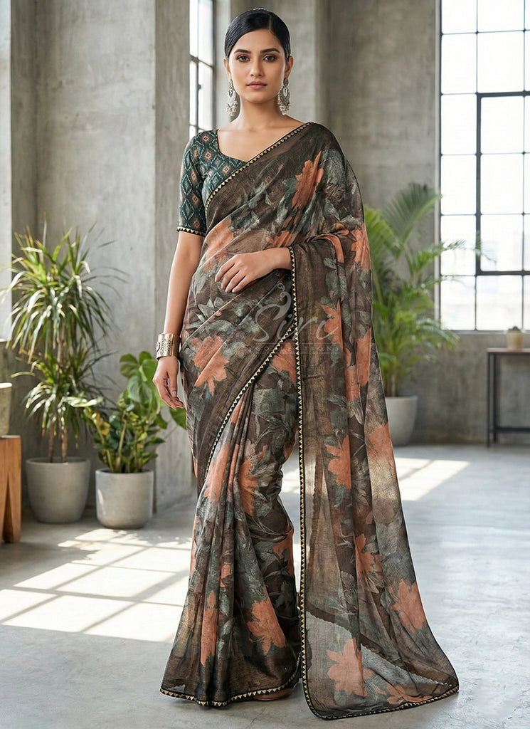 Description: Beautiful Printed Brasso Saree in Tiny Fancy Samosa Borders