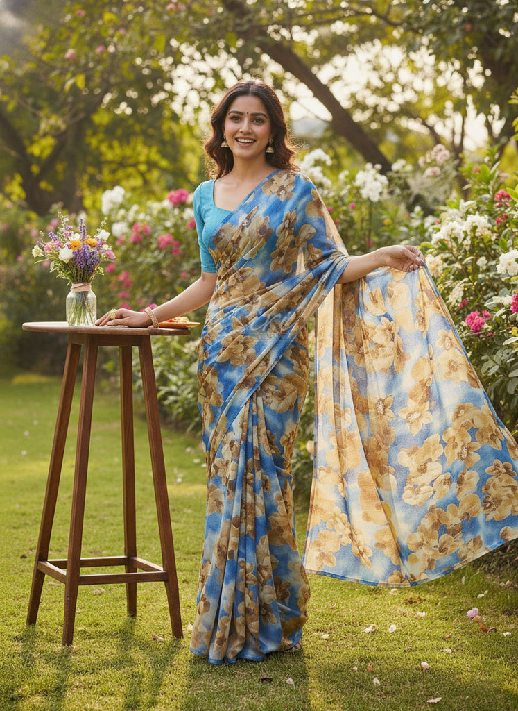 Description: Beautiful Latest Garden Vareli Printed Nara Chiffon Saree